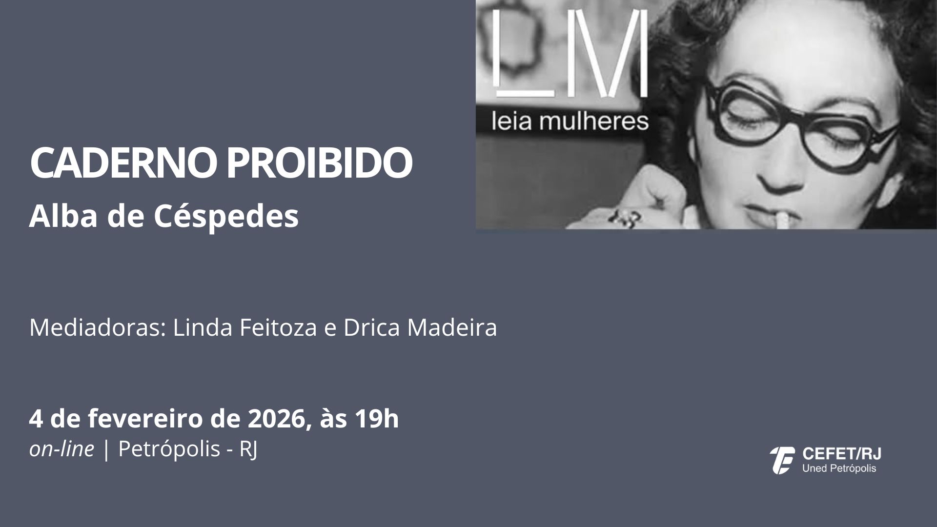 O encontro, que contará com a mediação de Linda Feitoza e Drica Madeira, será on-line no dia 4 de fevereiro, a partir das 19h, pelo Google Meet. Os interessados em participar devem solicitar o link do evento por meio das redes sociais – Leia Mulheres Petrópolis no Instagram e  grupo Leia Mulheres Petrópolis-RJ no Facebook