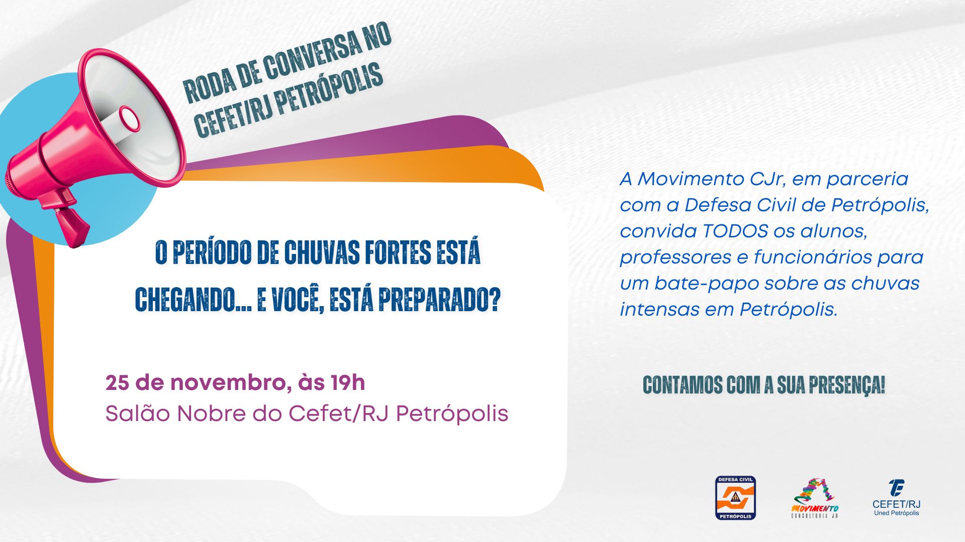 Com a chegada do período de chuvas mais fortes, a empresa júnior do Cefet/RJ Petrópolis –  Movimento Consultoria Júnior – promove no dia 25 de novembro (terça-feira) uma roda de conversa em parceria com a Defesa Civil da cidade. O evento acontecerá no Salão Nobre da unidade das 19h às 20h.