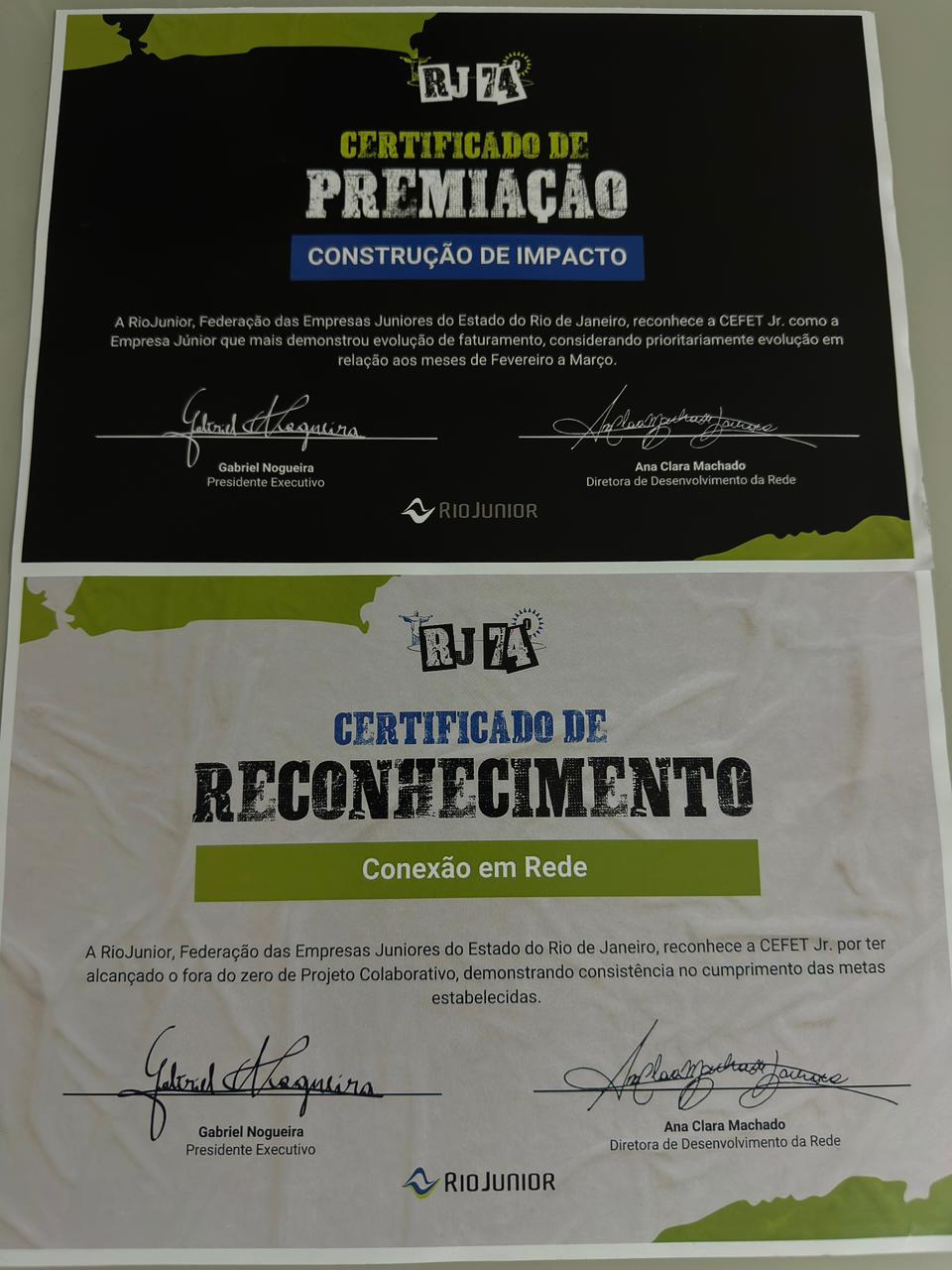 A empresa Cefet Jr. Consultoria, formada por alunos da graduação da Unidade Maracanã, foi contemplada com dois certificados pela Federação das Empresas Juniores do Estado do Rio de Janeiro (RioJunior). As premiações foram entregues durante o RJ74º, evento desenvolvido com o propósito de capacitar as lideranças em temas estratégicos para o sucesso no ambiente empresarial. O encontro ocorreu no sábado (21/3), no Sesc Casa Rosa, na Tijuca, no Rio de Janeiro (RJ).