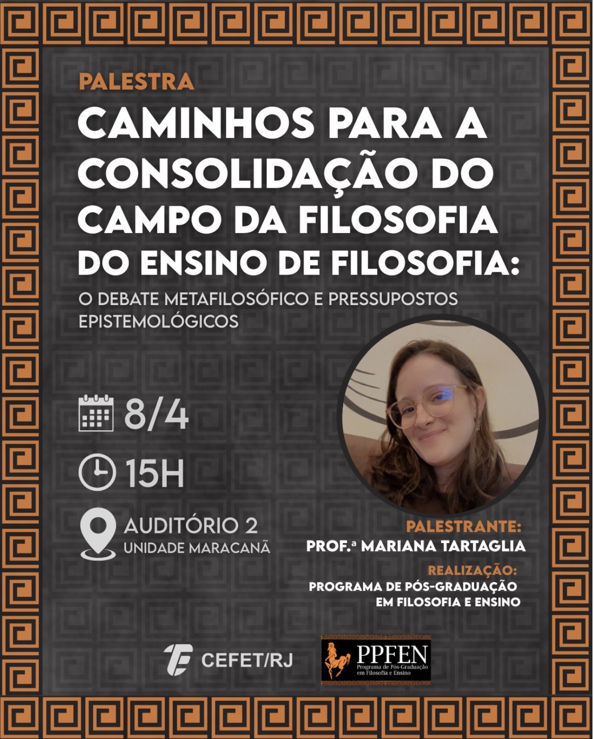 No dia 8 de abril, a Unidade Maracanã promoverá a palestra “Caminhos para a consolidação do campo da filosofia do ensino de Filosofia: o debate metafilosófico e pressupostos epistemológicos”, que será ministrada pela professora Mariana Tartaglia. O encontro será realizado às 15h, no Auditório 2, e é promovido pelo Programa de Pós-Graduação em Filosofia e Ensino (PPFEN). A atividade é aberta ao público e não exige inscrição prévia. Trata-se de uma oportunidade para estudantes, pesquisadores e interessados aprofundarem reflexões sobre os fundamentos e desafios da filosofia do ensino de Filosofia.