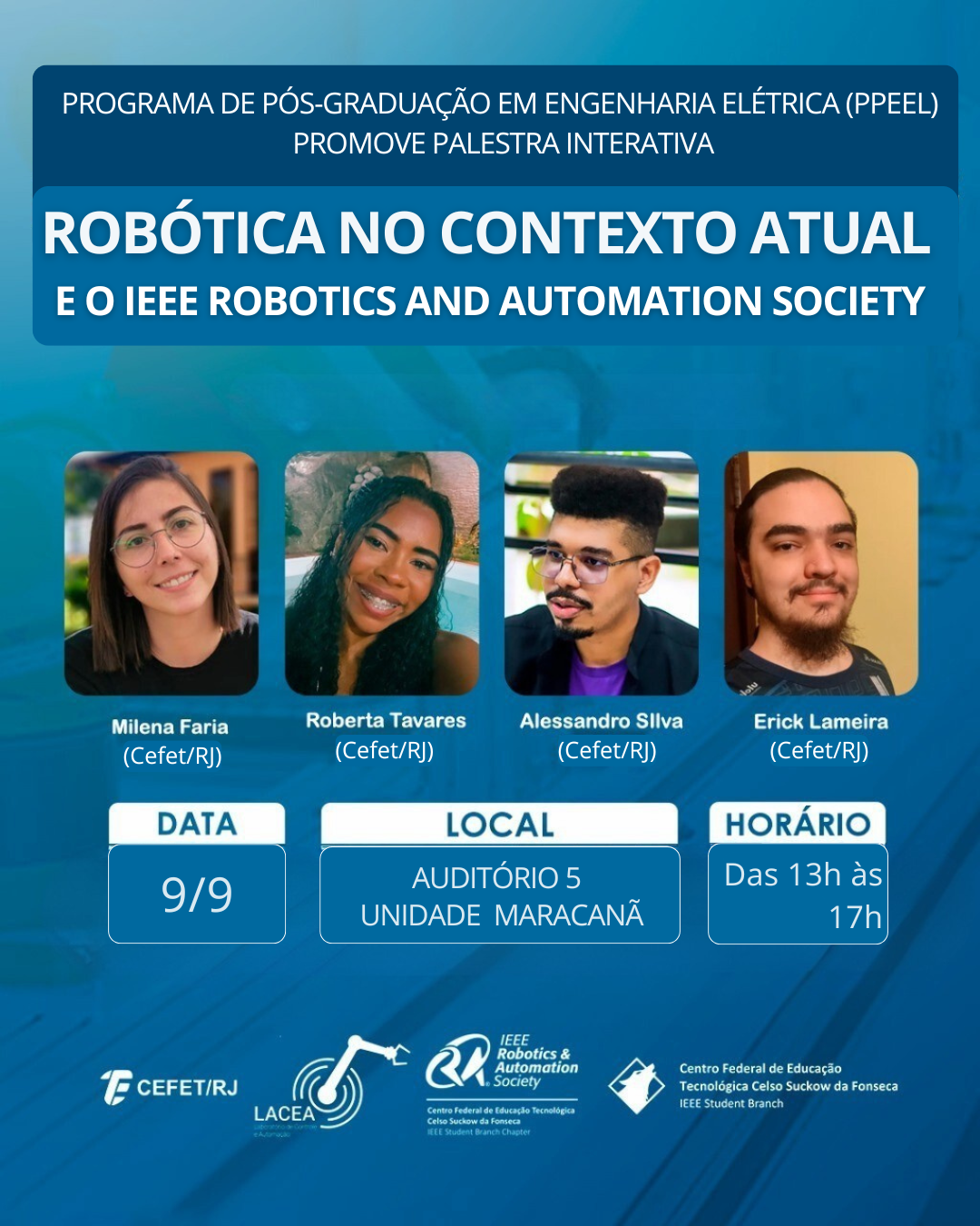 A atividade discutirá o estado da arte da robótica, destacando frentes emergentes como robótica colaborativa, veículos autônomos e robótica assistiva, além do papel do Instituto de Engenheiros Elétricos e Eletrônicos (IEEE) e da Sociedade de Robótica e Automação (RAS). Serão abordadas ainda oportunidades de pesquisa, cenários de mercado e estratégias de colaboração, incluindo iniciativas para formação, desenvolvimento profissional e engajamento estudantil. É uma oportunidade para estudantes e profissionais conhecerem tendências, trocarem experiências e ampliarem sua rede na área de robótica.