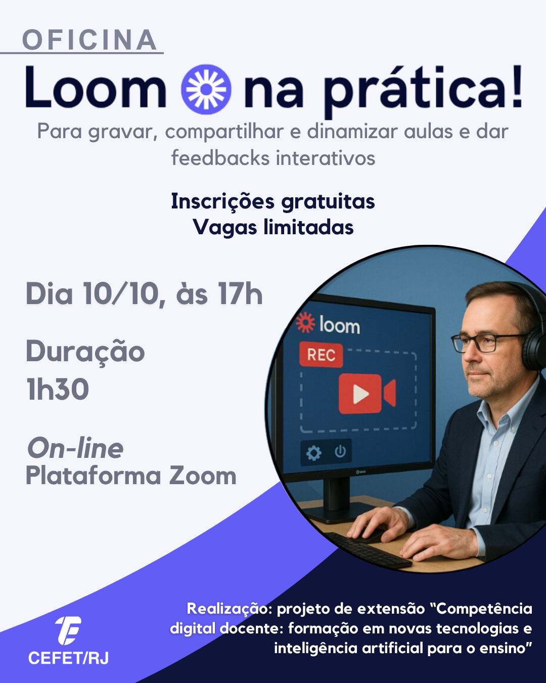 O projeto de extensão “Competência digital docente: formação em novas tecnologias e inteligência artificial para o ensino”, da Unidade Maracanã, promove a oficina “Loom na prática”, que tem como objetivo capacitar docentes para o uso pedagógico de ferramenta de gravação de tela, com vídeo e áudio. A formação acontece no dia 10 de outubro, às 17h, na modalidade on-line (via Zoom) e é voltada para professores que desejam criar conteúdos audiovisuais personalizados, como explicações de conteúdos, feedbacks comentados, tutoriais ou videoaulas curtas. A proposta busca integrar o uso consciente da tecnologia às práticas docentes, promovendo inovação, autonomia e acessibilidade no ensino de línguas e em outras áreas.