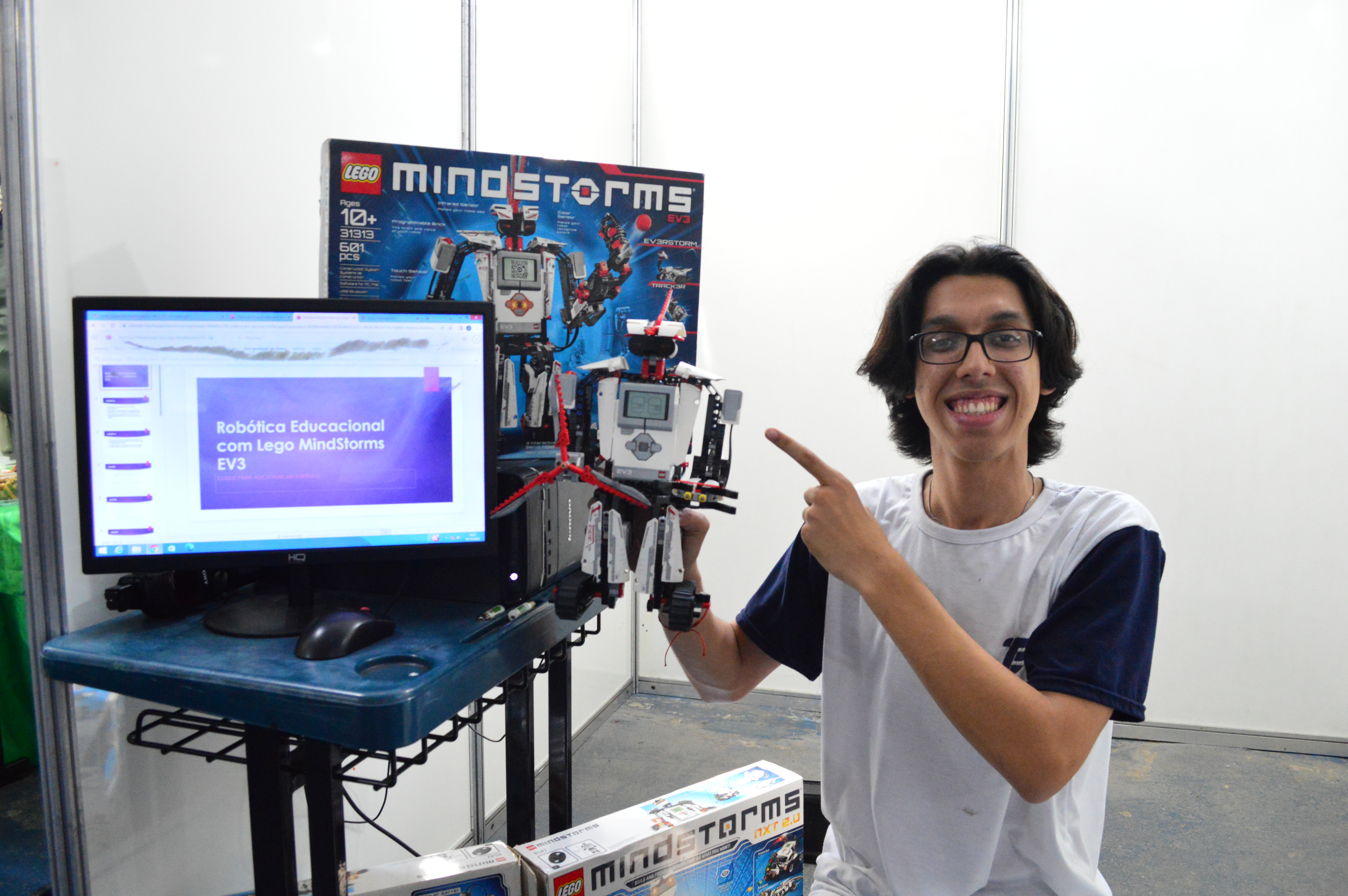 Bem menor e mais leve, mas não menos atrativo, um robô inteiramente construído com peças de Lego encontra-se logo no estande em frente. Adaptado com sensores que detectam gestos como acenos e sorrisos, ele responde com expressões básicas como “oi” e “tchau”. O robô foi  desenvolvido pelo estudante do curso técnico integrado ao ensino médio em Informática Daniel Dull, integrante do projeto “Robótica Educacional com Lego Mindstorms”, coordenado pelo professor Fábio Paschoal Júnior. Aluno do 3º ano, Daniel já conquistou diversas medalhas em olimpíadas nacionais e, atualmente, dá aulas de robótica para outros estudantes do ensino médio. “Estou saindo da instituição no fim do ano e quero compartilhar o que aprendi com os próximos que vão ficar. Senão, pra mim, não faz muito sentido”, completou o estudante.