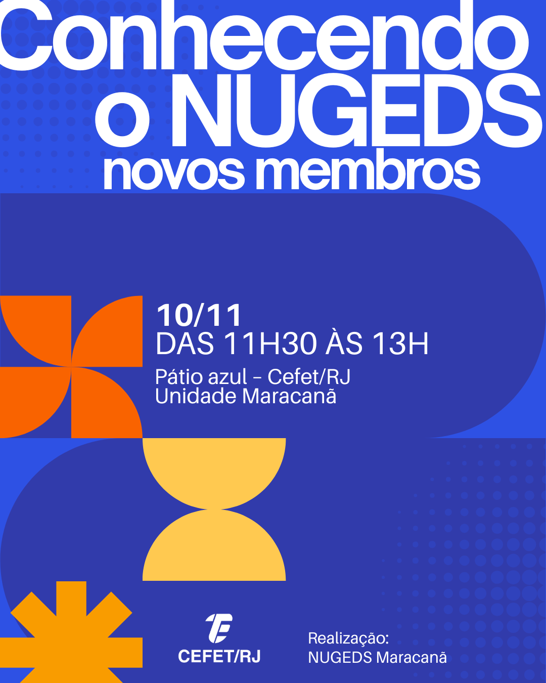 O Núcleo de Gênero e Diversidade Sexual (NUGEDS) do Cefet/RJ Unidade Maracanã convida a comunidade escolar para a ação "Conhecendo o NUGEDS: novos membros”, que será realizada no dia 10 de novembro, segunda-feira, das 11h30 às 13h, no pátio azul.