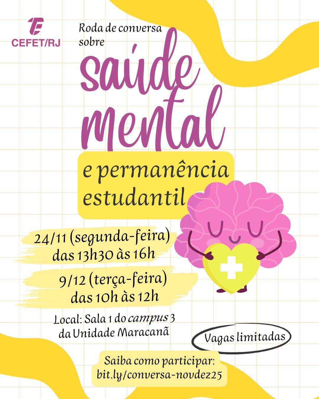 Nos dias 24 de novembro e 9 de dezembro, a Unidade Maracanã vai promover a “Roda de conversa sobre saúde mental e permanência estudantil”, voltada aos alunos da instituição. As atividades serão realizadas na sala 1 do campus 3. Para garantir um espaço de diálogo mais próximo entre os participantes, as vagas são limitadas. Os interessados devem preencher o formulário de pesquisa e, ao final, indicar a data e o horário de preferência. Clique aqui para acessar o formulário.