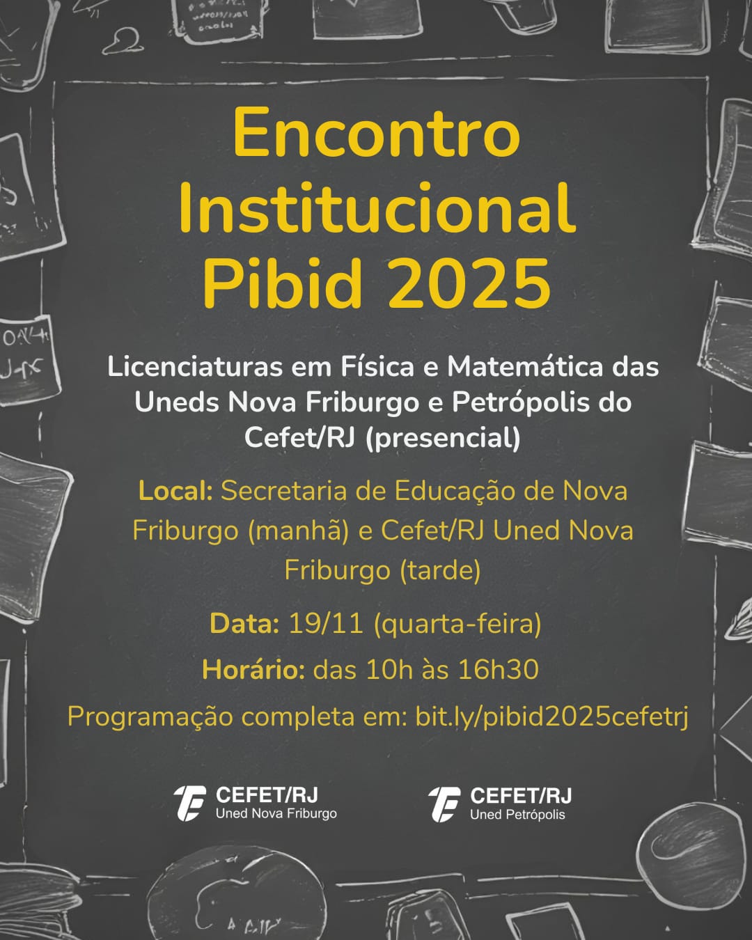 No dia 19 de novembro,  próxima quarta-feira,  das 10h às 16h30, será realizado o encontro do Programa Institucional de Bolsas de Iniciação à Docência (Pibid) das licenciaturas em Física e Matemática das Uneds Nova Friburgo e Petrópolis do Cefet/RJ. Com uma programação variada, o evento será realizado no Cefet/RJ Nova Friburgo e na Secretaria de Educação do município.