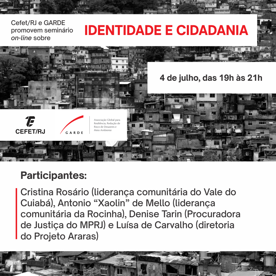 O Programa de Redução de Riscos de Desastres (RRD) do Cefet/RJ, em parceria com a Associação Global para Resiliência, Redução do Risco de Desastres e Meio Ambiente (Garde), realizará na próxima quinta-feira (4), às 19h, o seminário Identidade e Cidadania. O evento será on-line e busca promover a apresentação de iniciativas e o debate de projetos. O objetivo é a expansão da democracia e o exercício pleno da cidadania, a partir do fortalecimento de identidades e das interações comunitárias.