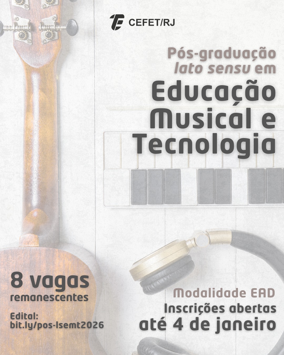 O curso de pós-graduação lato sensu em Educação Musical e Tecnologia, na modalidade educação a distância (EAD), está com inscrições abertas para oito vagas remanescentes. Os interessados em se candidatar à oportunidade devem se inscrever pelo link processoseletivo.cefet-rj.br até o dia 4 de janeiro. Podem concorrer pessoas com curso superior completo em qualquer área do conhecimento, preferencialmente em licenciatura em Música, Dança, Teatro, Artes Visuais ou bacharelado nas diversas linguagens artísticas. O curso é ofertado pela Unidade Maracanã e tem duração de um ano.