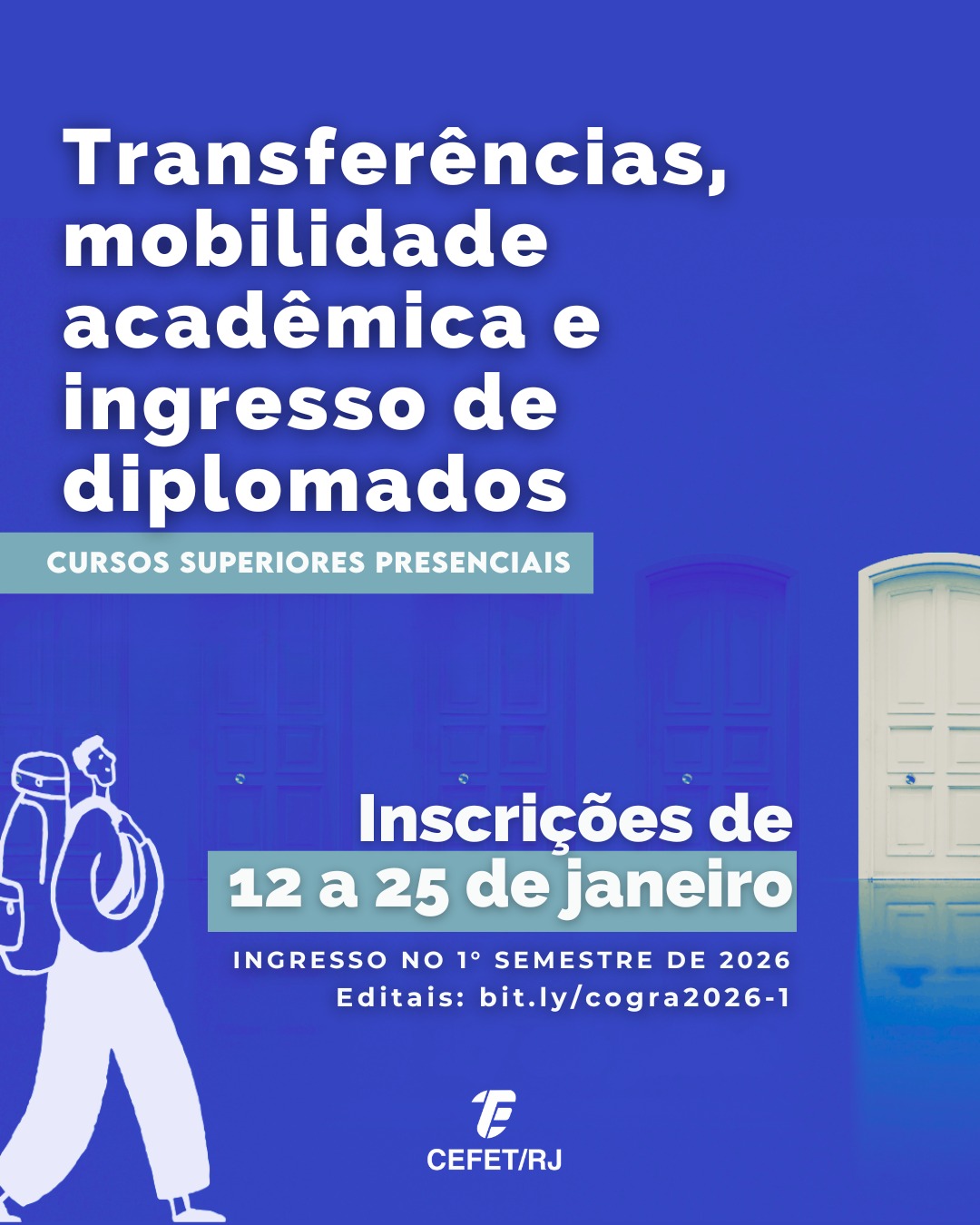Destinada aos estudantes dos cursos de graduação do Cefet/RJ que têm interesse em se inscrever em disciplinas dos cursos de bacharelado, licenciatura ou superior em tecnologia da instituição, na modalidade presencial, no primeiro período de 2026.