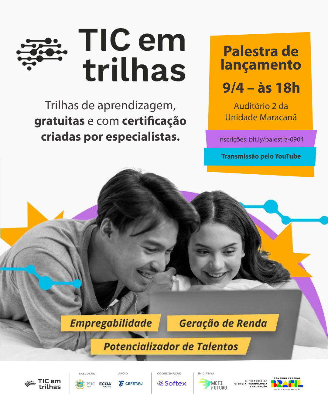No dia 9 de abril, o Auditório 2 da Unidade Maracanã receberá a palestra de lançamento do programa “TIC em trilhas”, resultado da parceria entre o Cefet/RJ e o Instituto ECOA, da Pontifícia Universidade Católica do Rio de Janeiro (PUC-Rio). A iniciativa oferecerá cursos gratuitos de Tecnologia da Informação e Comunicação (TIC) para estudantes, professores e servidores da instituição, com certificação da PUC-Rio e do Ministério da Ciência, Tecnologia e Inovação (MCTI). A palestra terá início às 18h e as inscrições podem ser feitas pelo link bit.ly/palestra-0904.